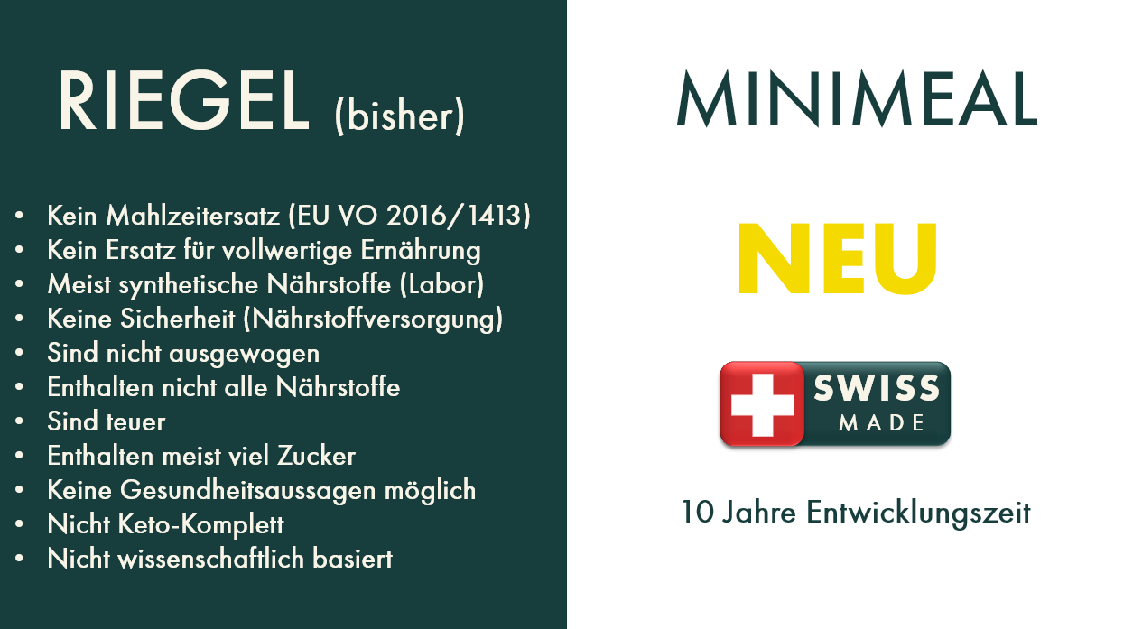 Das Alleinstellungsmerkmal von SUN Minimeal ist es, dass es sich nicht um einen Riegel, sondern um eine kleine Mahlzeit handelt, in der von Natur aus alle essentiellen Lebensbausteine in der richtigen Menge enthalten sind. Es können mehr als 180 gesundheitsbezogene Angaben gemacht werden und ein vollwertige Nährstoffversorgung ist bereits mit 800 anstelle mit 2400 kcal am Tag möglich. Die Ressourcen rund um die Ernährung lassen sich damit um mehr als 90% einsparen.
