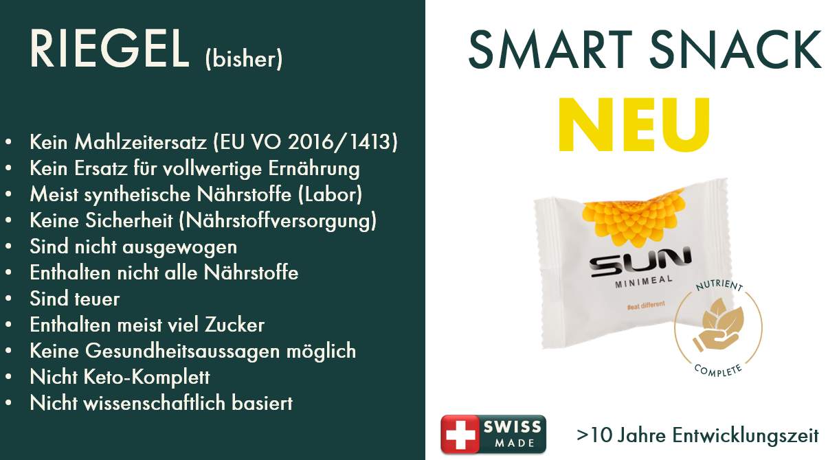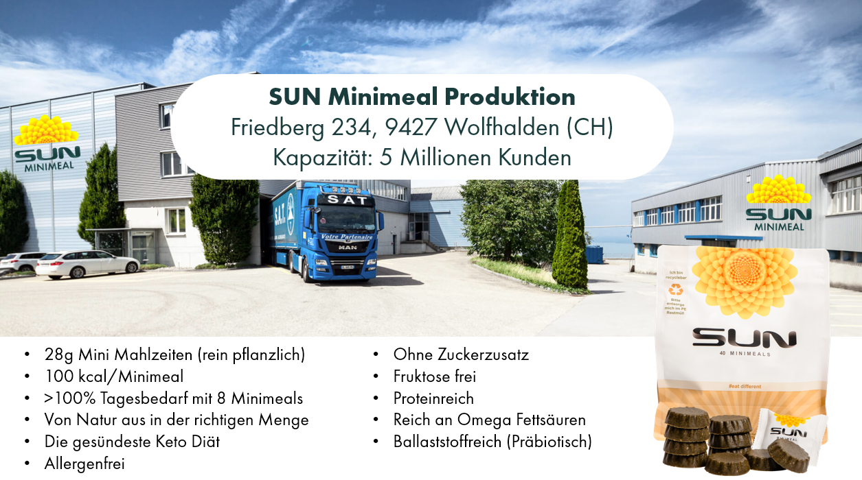 SUN Minimeal ist ein intelligenter Smart-Snack, der vom Schweizer Lebensmittelproduzent SUN AG hergestellt wird. Die Firma hat den Sitz in Friedberg 234, 9427 Wolfhalden und existiert seit 2016. Mit einer verfügbaren Produktionsfläche von derzeit 6300 Quadratmetern, können mehr als 5 Millionen Kunden permanent beliefert werden.